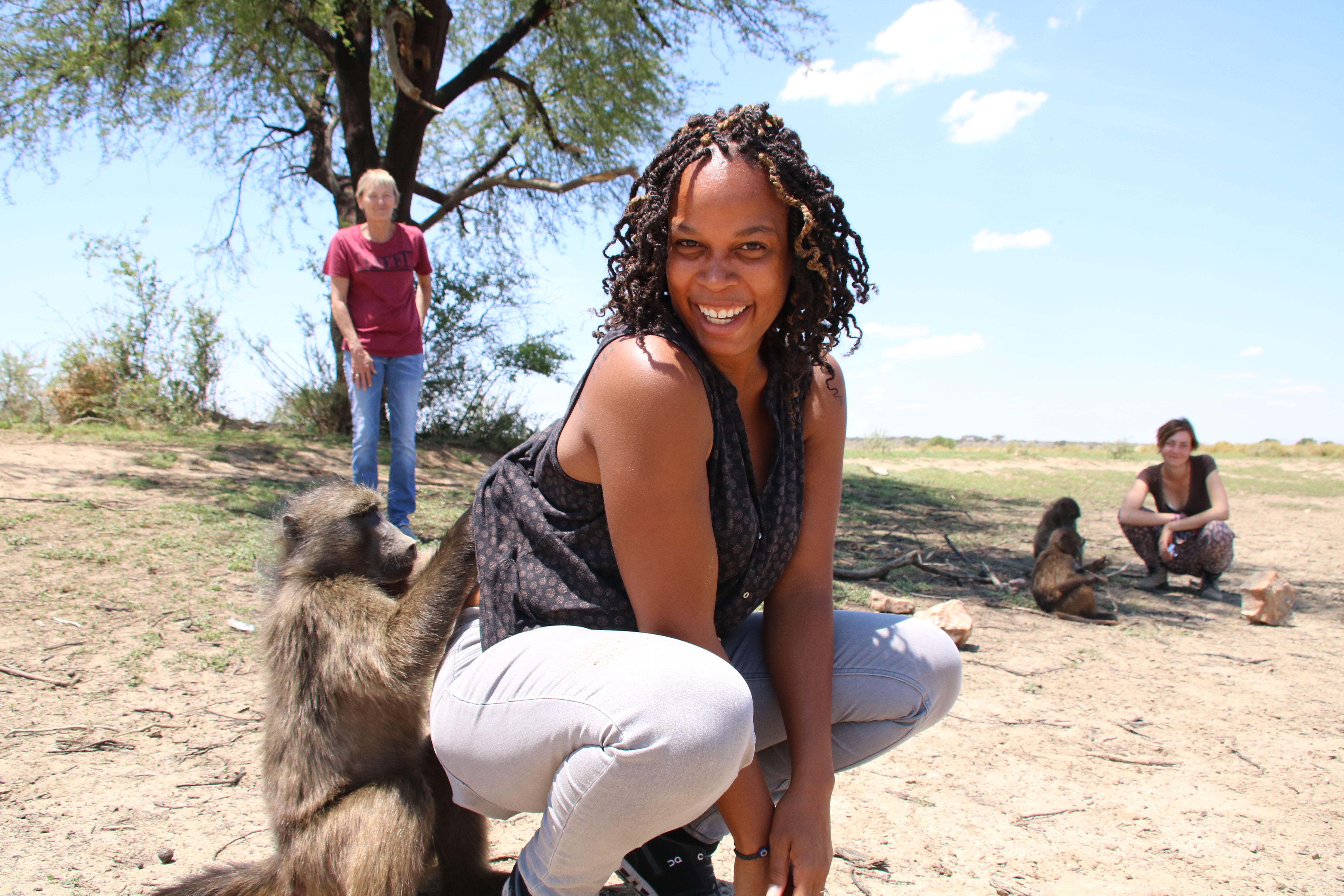 And just as she laughed a small baboon jumped from a tree onto her back. She yelped a little and then grabbed the baby baboon’s arms as she swung him around like a child and you could hear the baboon’s laughter.